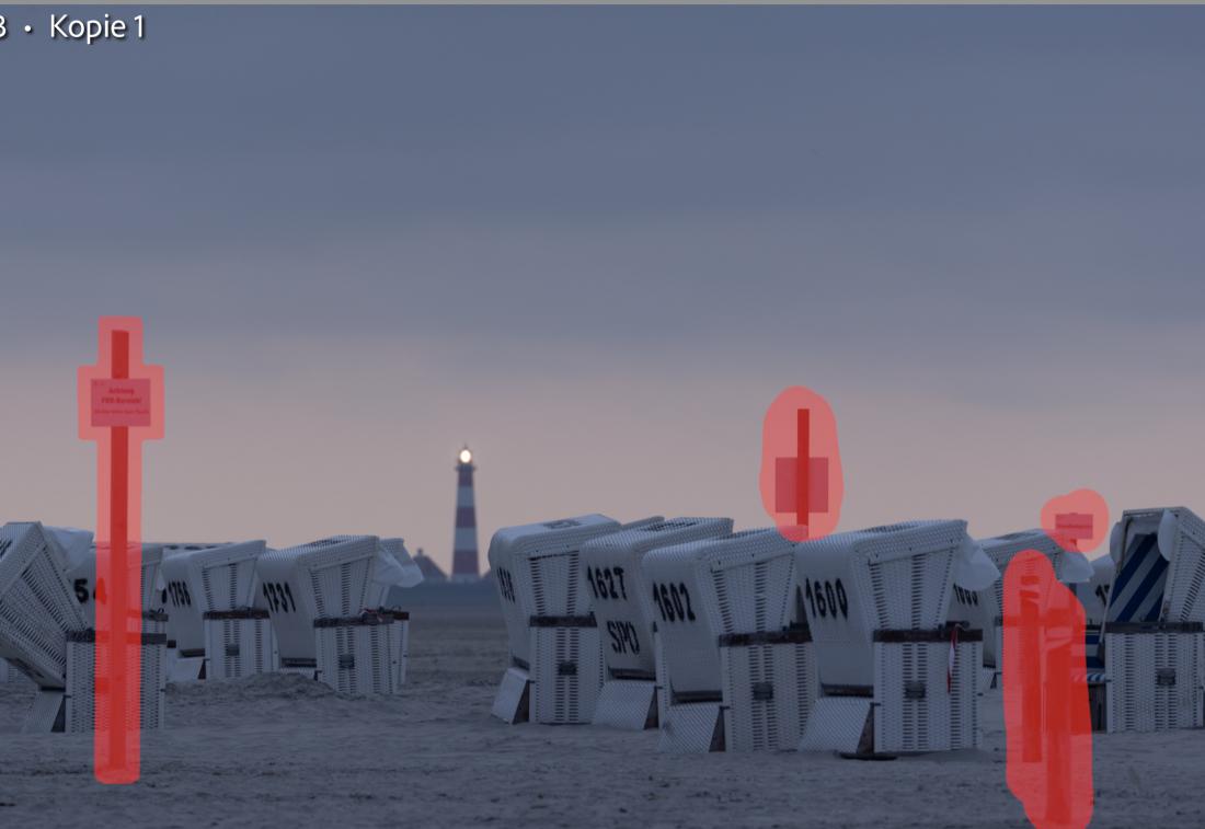 Beispiel: Entfernen von Gegenständen vor einem schwierigen Hintergrund. Die vielen Hinweisschilder in SPO am Strand sind immer wieder eine Herausforderung. Eine Aufnahme ohne die störenden Schilder ist fast unmöglich geworden. Oft sind sie auch schwer zu entfernen. Auch hier hilft ein KI-Tool.